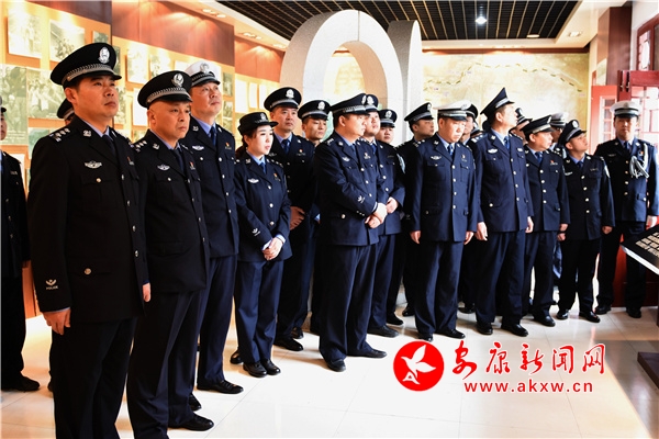 在巍然聳立的烈士紀(jì)念碑前,全體民警輔警整齊列隊、莊重肅立。民警代表首先向英雄烈士敬獻(xiàn)了花籃,全體人員脫帽肅立、鞠躬默哀,并依次上前瞻仰英雄烈士,通過回顧英雄事跡,表達(dá)對革命先烈的深切悼念和無限哀思。隨后,全體黨員同志站在烈士紀(jì)念碑前高舉右手,莊嚴(yán)宣誓,在鏗鏘誓言中重憶入黨入警初心、告慰英靈。
