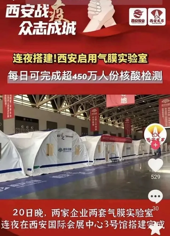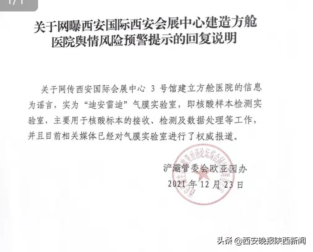 近日,短視頻平臺有網民發(fā)視頻稱“西安國際會展中心正在建方艙醫(yī)院”,經核實,該信息為謠言,實為“迪安雷迪”氣膜實驗室,用于核酸檢測工作。