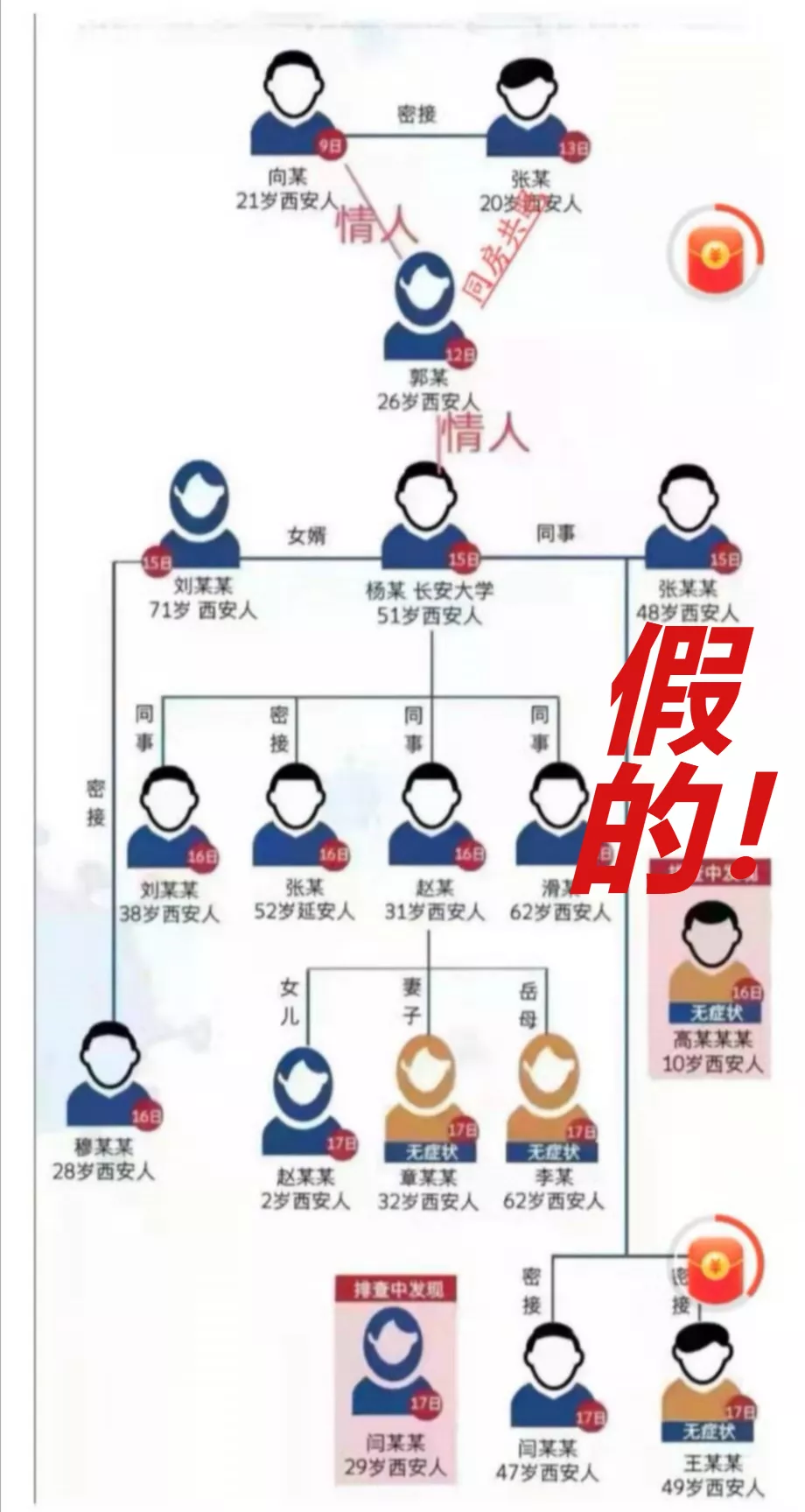 網上流傳一張確認病例傳播鏈分解圖,在病例之間標注“情人”關系,并傳言此次疫情傳播因素之一,是因為西安首例病例與子牛門診的護士為情人關系,導致疫情擴散,經核實,該圖盜用華商網12月18日制作的新聞作品圖片。該信息為虛假信息,造謠的人已被拘留。