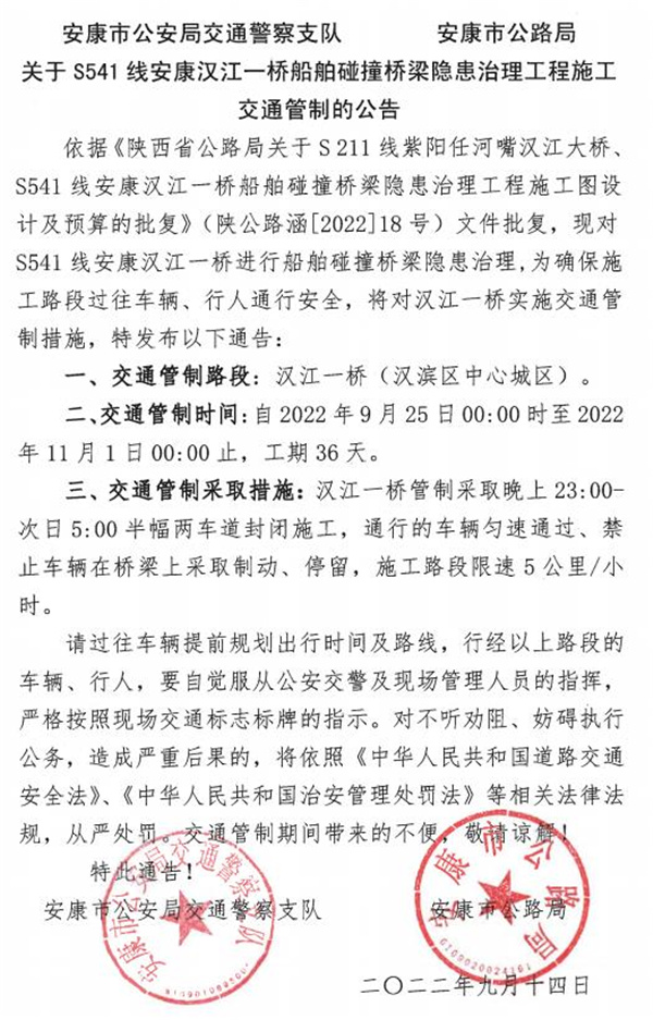 9月25日至11月1日安康漢江一橋?qū)⑦M(jìn)行船舶碰撞橋梁隱患治理工程施工,將對(duì)漢江一橋?qū)嵭?strong>交通管制36天,管制采取晚上23:00-次日5:00半幅兩車道封閉施工,通行的車輛勻速通過,禁止車輛在橋梁上采取制動(dòng)、停留,施工路段限速5公里/小時(shí)。