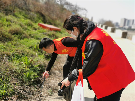 志愿者們在漢江邊開展生態(tài)環(huán)保、垃圾分類宣傳,并清理了河道邊的空水瓶、白色垃圾、煙頭等垃圾。