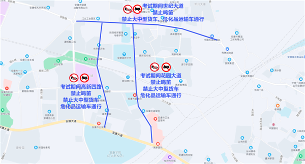 2023年普通高校招生考試(以下簡(jiǎn)稱“高考”)將于6月7日至6月8日舉行,為保證廣大考生的交通安全及考點(diǎn)周邊的交通秩序,給考生創(chuàng)造良好的考試環(huán)境,確保考試順利進(jìn)行。根據(jù)《中華人民共和國(guó)道路交通安全法》及相關(guān)法律法規(guī),安康市公安局高新分局交通管理大隊(duì)決定在考試期間對(duì)高新區(qū)部分道路實(shí)施交通管制措施,現(xiàn)將具體內(nèi)容通告如下: