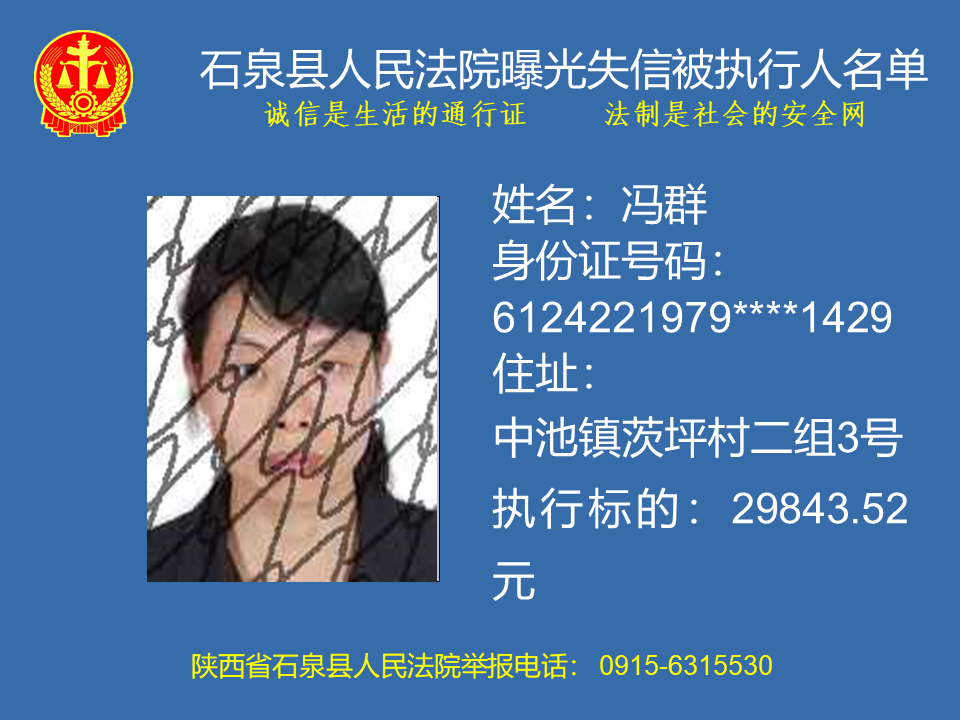 為了進(jìn)一步加大執(zhí)行力度,保障勝訴當(dāng)事人的合法權(quán)益,推進(jìn)社會(huì)誠(chéng)信體系建設(shè),依照《中華人民共和國(guó)民事訴訟法》、《最高人民法院關(guān)于公布失信被執(zhí)行人名單信息的若干規(guī)定》等法律、司法解釋的有關(guān)規(guī)定,現(xiàn)對(duì)一批已進(jìn)入執(zhí)行程序,且尚未全部履行義務(wù)的被執(zhí)行人進(jìn)行媒體曝光,歡迎廣大群眾支持石泉縣人民法院的工作,向我院提供被執(zhí)行人的財(cái)產(chǎn)線索,使生效法律文書能夠得到切實(shí)執(zhí)行,讓人民群眾切實(shí)感受到公平正義就在身邊。