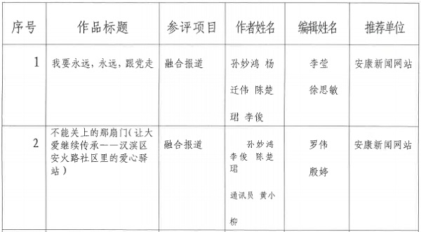 按照省記協(xié)要求,特將推薦參評2023年度陜西新聞獎融合報道初評的作品予以公示。公示期為2024年1月16日至1月22日,在此期間內(nèi)如有異議請向新聞管理部反饋。報送作品如下:?