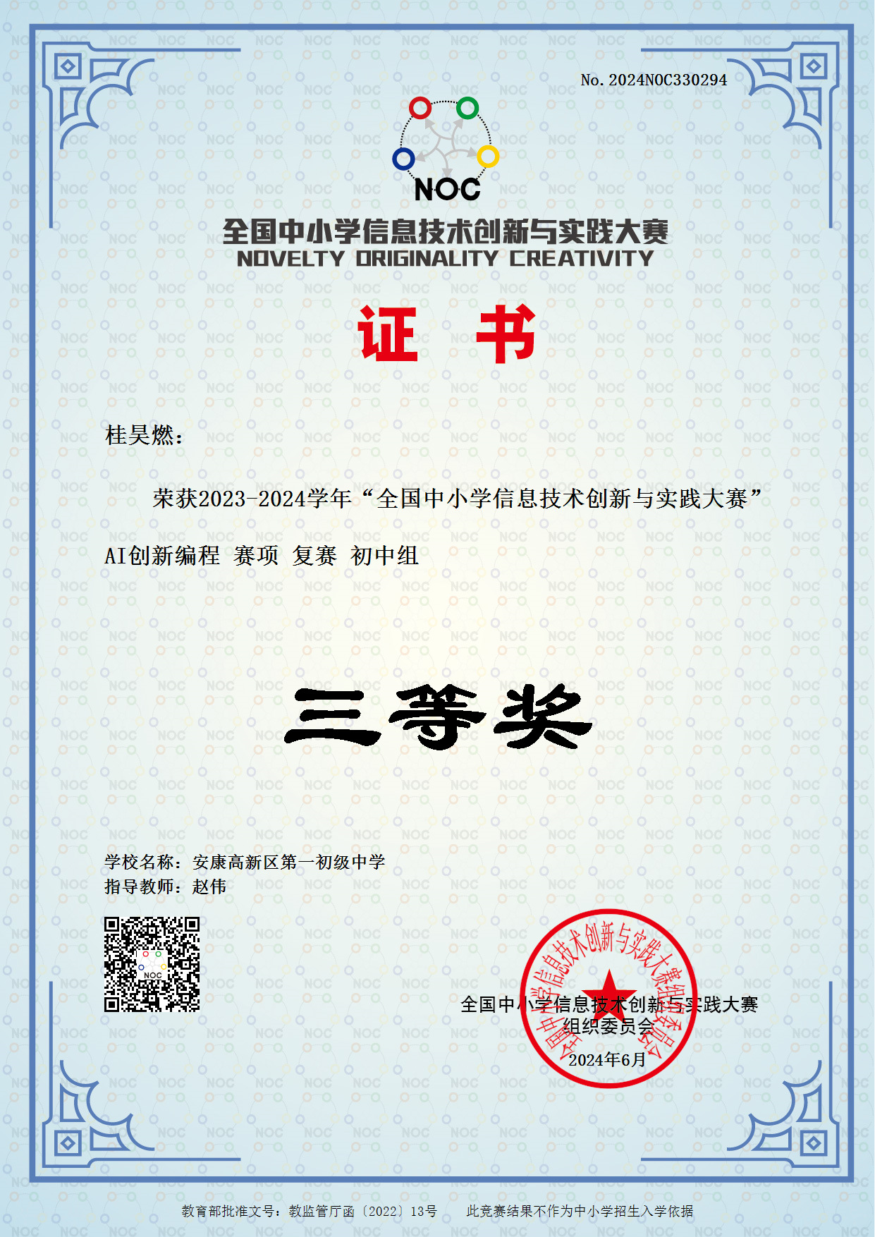 本網(wǎng)訊(通訊員 趙偉)近日,高新區(qū)第一初級中學(xué)桂昊燃同學(xué)在全國中小學(xué)信息技術(shù)創(chuàng)新與實踐大賽復(fù)賽中榮獲三等獎,該生由趙偉老師指導(dǎo)。