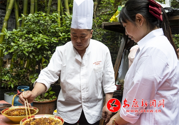 但隨著時代的發(fā)展,人們消費(fèi)理念的更新,能制作傳統(tǒng)白河“三點(diǎn)水”宴席的人越來越少,偌大一個縣,找不出幾個能夠獨(dú)當(dāng)一面制作傳統(tǒng)宴席白河“三點(diǎn)水”的廚師。所以他毅然決定辭去高薪的主廚工作,奔走于鄉(xiāng)村,上門做家政服務(wù),在實(shí)地操作技藝中傳幫帶一批會制作白河“三點(diǎn)水”宴席的鄉(xiāng)廚。