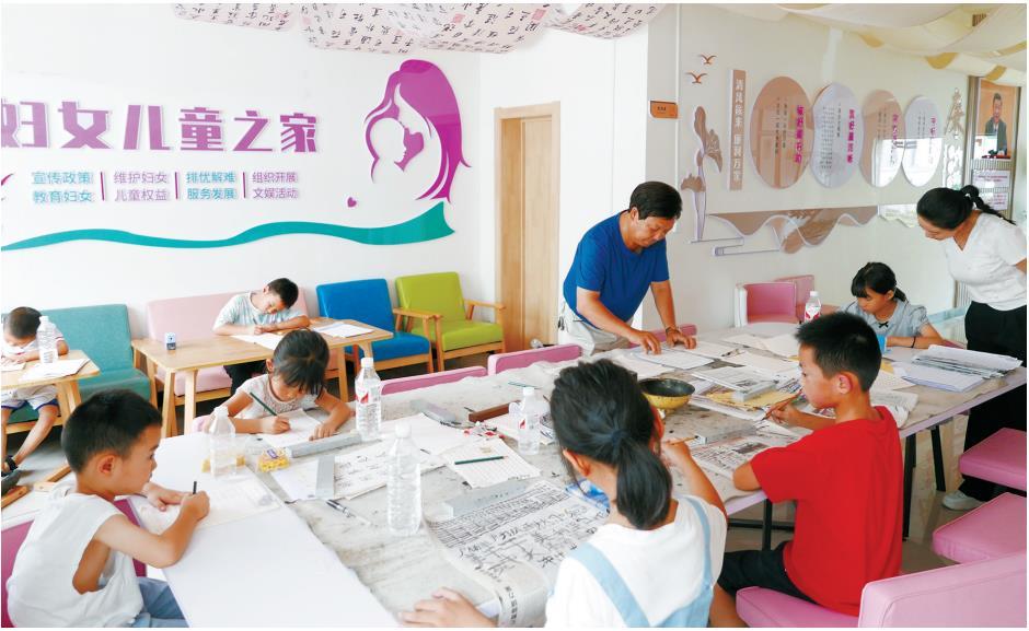 8月12日,塘坊壩社區(qū)聯(lián)合子中心,兒童在練習書法。