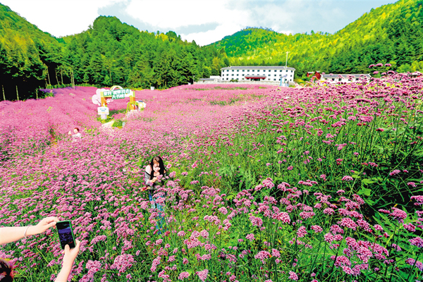 中秋節(jié)期間,平利千家坪森林公園天書峽馬鞭草花競(jìng)相怒放。如畫的景色吸引眾多游客前來(lái)賞景打卡。(詹永桂 攝)