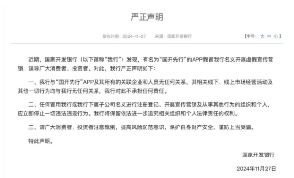 詳情:近期,有名為“國開先行”的APP假冒國家開發(fā)銀行名義開展虛假宣傳營銷,誤導(dǎo)廣大消費(fèi)者、投資者。對(duì)此,國家開發(fā)銀行于11月27日在官網(wǎng)發(fā)布《嚴(yán)正聲明》: