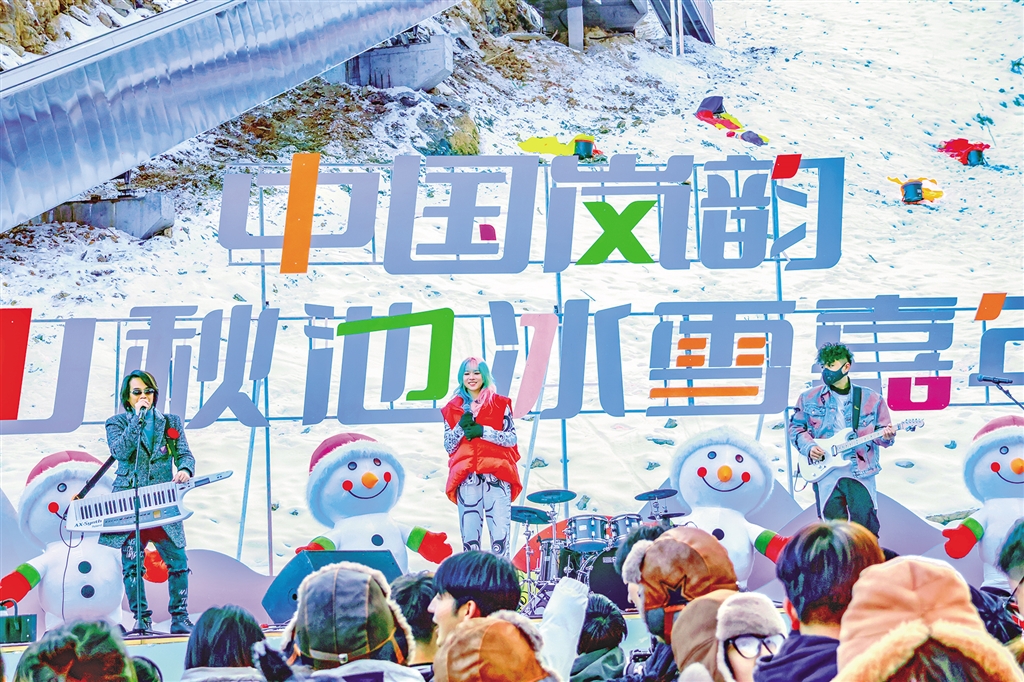 在白雪皚皚與瑤林玉樹交相輝映的雪景勝地,演歌會在唯美動人的開場舞《冰雪奇緣》中拉開帷幕。主舞臺上,勝三分樂隊率先登場,伴隨著強烈節(jié)奏的鼓點與電吉他,為觀眾帶來了《你要跳舞嗎》等經(jīng)典歌曲炒熱現(xiàn)場氣氛。嫂子樂隊作為一支全女子樂隊當仁不讓火力全開,《愛的初體驗》《別問我什么是迪斯科》等動感樂曲徹底點燃觀眾的激情。來自中國臺灣的飛兒樂團重磅登場,為大家?guī)砟捴巳丝诘牧餍忻段覀兊膼邸贰肚曛畱佟贰禠ydia》等歌曲,在現(xiàn)場氛圍的帶動下,游客紛紛揮舞著手中的氣球跟唱,并自發(fā)組成游行隊伍,在冰天雪地中放肆歡笑玩樂。演歌會期間還穿插了舞蹈《雪花芬芬》《魅力四射》、小丑表演《金蛇送?!返染使?jié)目。