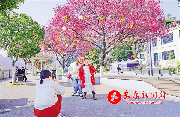 石泉縣濱江大道上紅梅競(jìng)相綻放,廣大游客駐足觀看,打卡留念。譚文昌 攝?