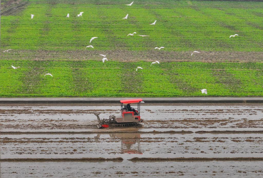 2月25日,在浙江省瑞安市馬嶼鎮(zhèn)儒陽村,農機在田間犁地,白鷺低空而飛(無人機照片)。早春時節(jié),各地農民搶抓農時,開展春耕、春管等農事活動,田間地頭到處是一派人勤春早的忙碌景象。 新華社發(fā)(蘇巧將攝)