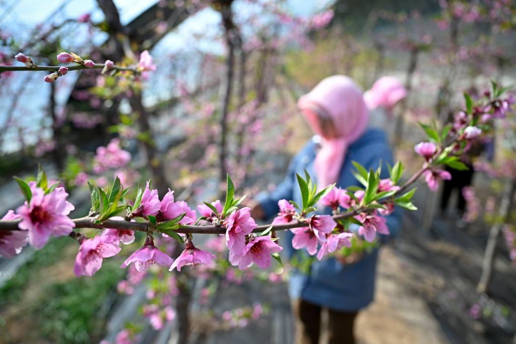 2月24日,在云南省文山壯族苗族自治州文山市馬塘鎮(zhèn)珍珠蜜桃基地,農民辛勤護理桃花。春回大地,各地搶抓農時,田間地頭一片繁忙勞作的景象。新華社發(fā)(熊平祥攝)