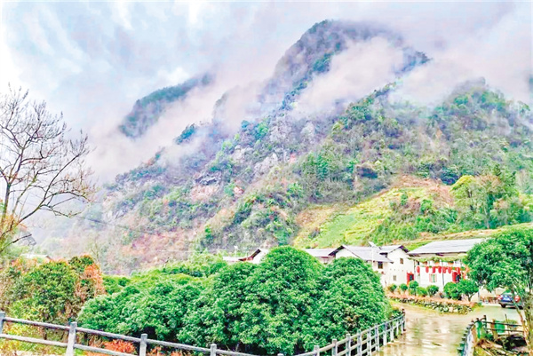 推開房門,晨霧尚未散盡,細(xì)雨斜斜地織著。老人們常說“有雨山戴帽,無雨半山腰”,這話在此時格外應(yīng)景——裊裊云霧沉甸甸地壓住遠(yuǎn)處的峰頂,像給每座山頭都戴了一頂灰絨帽子,讓群山失去了往日的險峻,只留下青灰色的輪廓,恍若一幅優(yōu)美的寫意水墨畫。等到午后雨勢稍小,云霧退到半山腰,卻始終戀著大山不肯消散。隨著一陣陣微風(fēng)拂起,那些云霧像被吹落的玉帶,在墨綠的樹林間織出半透明的簾幕。