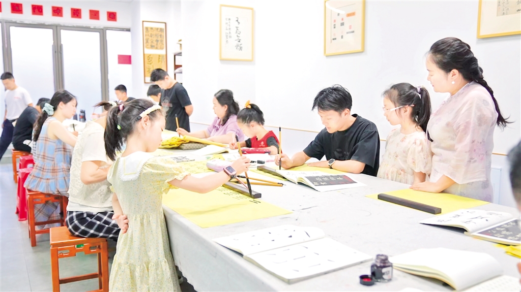 暑期的夜晚,漢濱區(qū)市民藝術(shù)夜校處處洋溢著熱鬧氛圍。在吾悅廣場校區(qū)的親子書法教室里,十幾個孩子與家長圍坐一桌,目光專注地跟隨老師的講解,生怕錯過任何一個知識點。