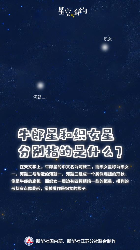 中國科學(xué)院紫金山天文臺科普主管王科超說,在天文學(xué)上,代表牛郎、織女的天體分別是牛郎星和織女星。牛郎星的中文名為河鼓二,織女星為織女一,它們分別是天鷹座和天琴座的亮星。河鼓二與附近的河鼓一、河鼓三組成一個類似扁擔(dān)的形狀,像是牛郎的扁擔(dān)。而織女一周邊有四顆稍暗一些的恒星,排列的形狀有點(diǎn)像菱形,常被看作是織女的梭子。