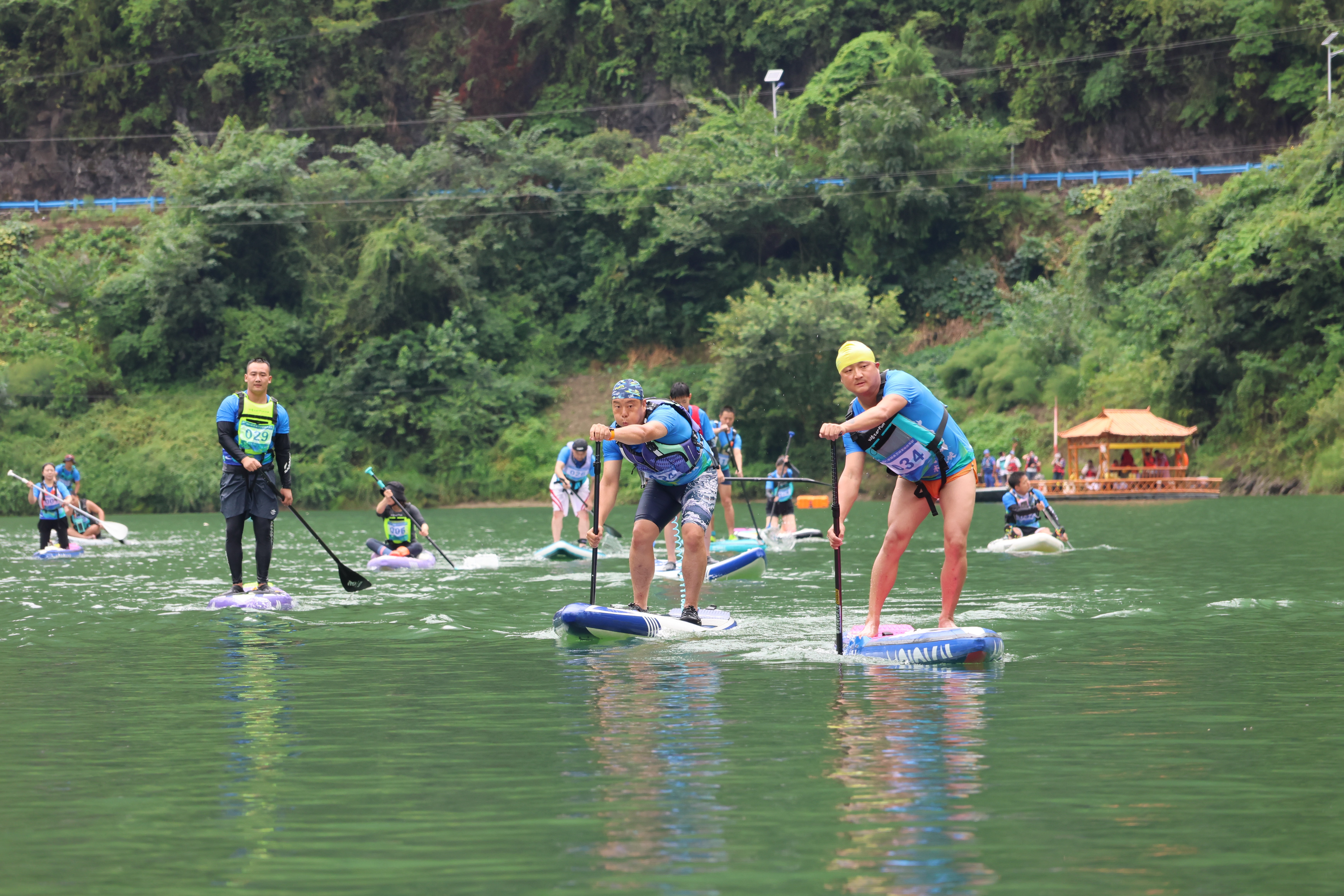 隨著發(fā)令笛聲劃破寧靜,49名選手揮槳競逐,一道道鮮艷的槳板如彩蝶點水,在翠谷碧波間劃出粼粼波紋,體育的活力與自然的靜謐交相輝映,賦予這片山水別樣的動感與詩意。