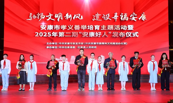本次活動(dòng)以“弘揚(yáng)文明新風(fēng) 建設(shè)幸福安康”為主題,由市委宣傳部主辦、石泉縣委和縣政府承辦,旨在深入學(xué)習(xí)貫徹黨的二十屆四中全會(huì)精神,扎實(shí)推進(jìn)崇德向上幸福安康建設(shè)?;顒?dòng)現(xiàn)場(chǎng),通過播放典型人物短片、現(xiàn)場(chǎng)互動(dòng)訪談等形式,生動(dòng)再現(xiàn)了陳登發(fā)、高虎、黃壽琴等好人代表的感人事跡。市級(jí)領(lǐng)導(dǎo)及“中國(guó)好人”“陜西好人”等先進(jìn)典型代表為28名新入選的“安康好人”頒發(fā)紀(jì)念證書?;顒?dòng)現(xiàn)場(chǎng)同時(shí)發(fā)布了2025年安康市“新時(shí)代好少年”名單,24名青少年獲得殊榮。