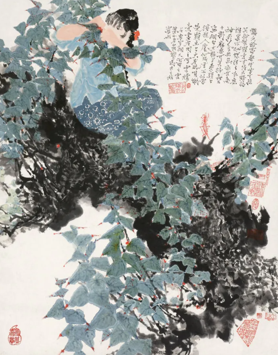 題識(shí):蠶女齡喬桑,昔有王孫笑粉妝。羅素有情天降福,誰(shuí)家不秘王祖。衣無(wú)神采食無(wú)魚(yú),永世商裔掛麻桑??尚γ尴x(chóng)無(wú)飛翅,白女敢上桑顛上。俯視人寰何所有,不似當(dāng)(年)楚霸王。上天有路唯蛾素,畫(huà)者因之寫(xiě)云。石魯寫(xiě)朝天河畔之云婆,小名安蛾,為女之姑家也?!恫缮D》,2010春拍成交價(jià)1064萬(wàn)元。