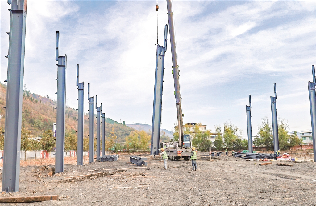 11月26日,紫陽高新區(qū)冷鏈倉儲物流園項目第一批鋼構材料進場,工人們正在開展吊裝作業(yè)。 肖昌尉 攝