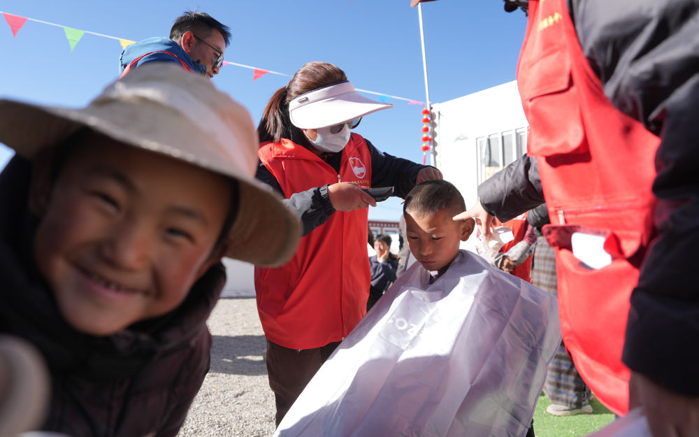 ??2025年1月26日,志愿者在西藏拉孜縣吉如村安置點為孩子們理發(fā)。西藏定日縣6.8級地震發(fā)生后,志愿者們迅速參與救援搜救、協(xié)助搭建帳篷、搬運賑濟物資、協(xié)調村民所需。數(shù)百名大學生組成志愿者服務隊,白天為安置點的孩子們輔導作業(yè)、陪孩子們運動;晚上組成巡邏隊,守護安置點的安寧。