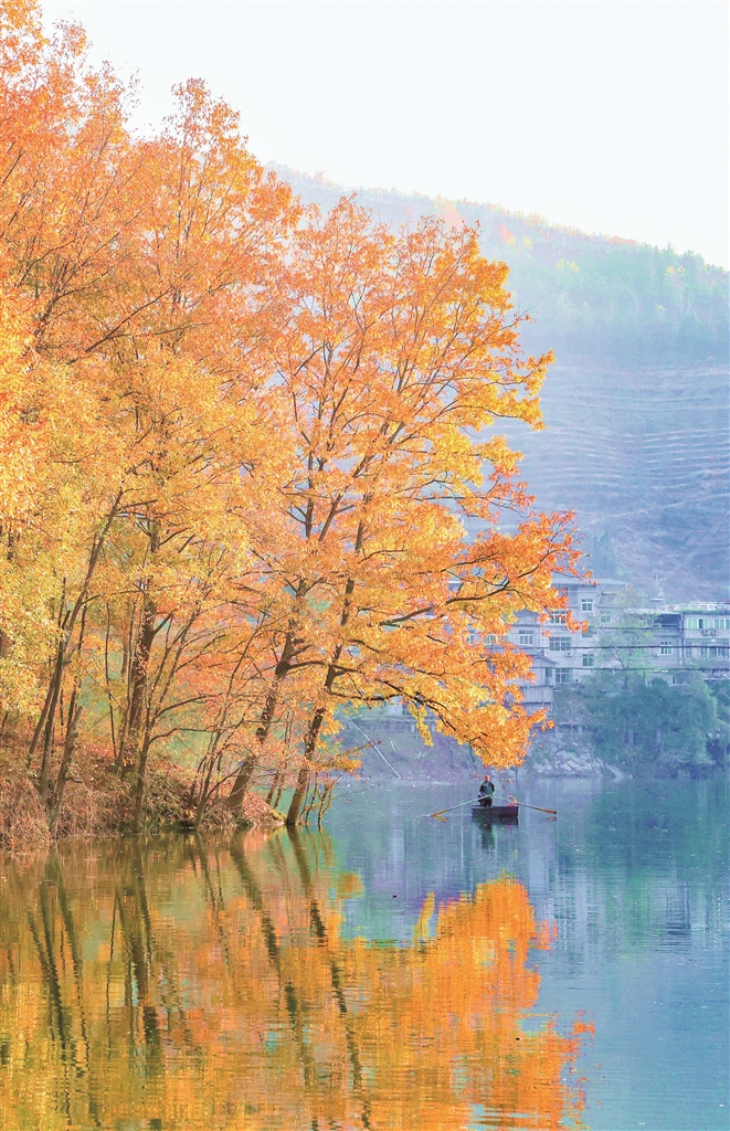 待到霧散天青,沙坪河便展露出它清澈的容顏。兩岸層林盡染,漫山的斑斕都被河水溫柔收納。一川碧水如鏡,完整復刻出天空與彩林的倒影,虛實交錯,舟行其上,仿佛滑入一幅靜止的油畫。山偎著水,水映著山,靜謐而又絢爛。?