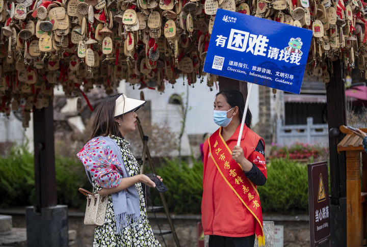 2023年5月18日,一名游客(左)在麗江古城向志愿者咨詢。2015年12月,云南麗江古城保護管理局牽頭成立了麗江古城旅游志愿者服務(wù)隊,志愿者主要來自市區(qū)機關(guān)單位、古城保護管理局、古城經(jīng)營戶、在校學(xué)生、社區(qū)居民等,常年在古城內(nèi)提供旅游咨詢、道路指引、文明引導(dǎo)等志愿服務(wù)。