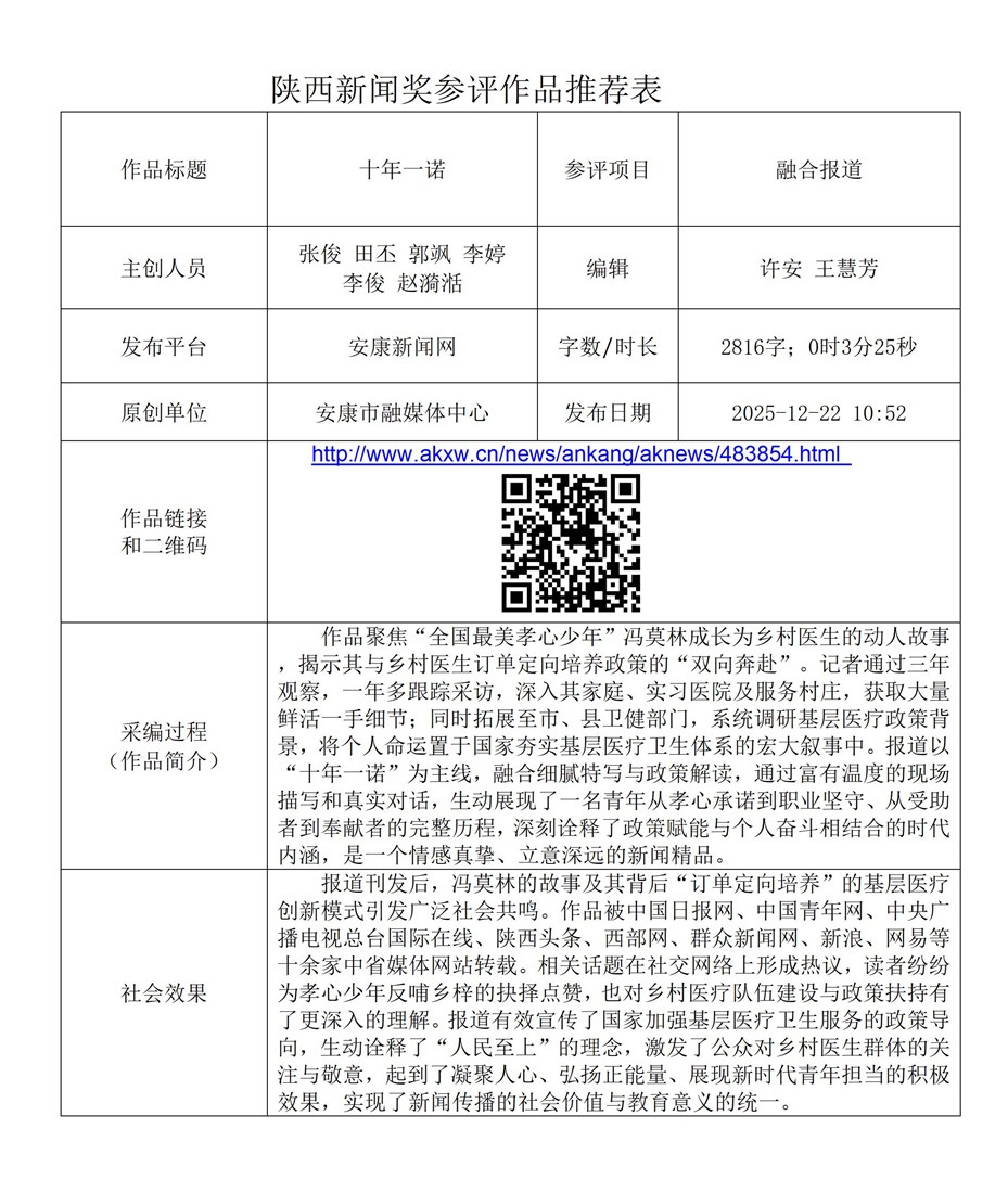 根據(jù)《陜西新聞獎、陜西省優(yōu)秀新聞工作者評選辦法》和《關于開展2025年度陜西新聞獎融合報道、應用創(chuàng)新和新媒體新聞專欄作品推優(yōu)工作的通知》要求,經(jīng)個人申報、部門推薦和中心編委會嚴格篩選,對以下3件2025年度陜西新聞獎融合報道、應用創(chuàng)新、新媒體新聞專欄參評作品進行公示。(作品推薦表附后)
