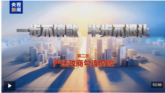 由中央紀委國家監(jiān)委宣傳部與中央廣播電視總臺央視聯(lián)合攝制的電視專題片《一步不停歇 半步不退讓》,1月12日在總臺央視綜合頻道晚8點檔播出第二集《嚴懲政商勾連腐敗》,央視新聞新媒體平臺同步播發(fā)。