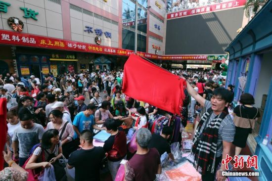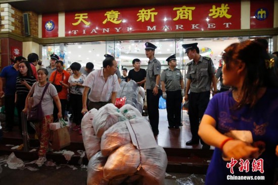 9月15日,商戶在北京天意商城甩賣(mài)商品,吸引大批顧客搶購(gòu)。天意商城是北京規(guī)模最大的小商品批發(fā)兼零售市場(chǎng),為疏解北京非首都功能,天意商城將于9月16日關(guān)門(mén)停業(yè)。中新社記者 盛佳鵬 攝