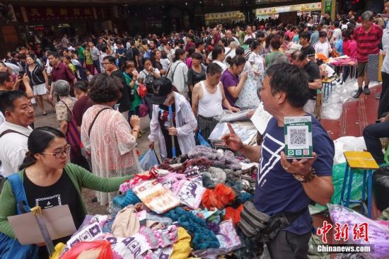 9月15日,天意商戶舉起二維碼方便顧客掃碼支付,以新式支付方式助力傳統(tǒng)零售。當(dāng)日,自1992年開(kāi)業(yè)至今的北京天意市場(chǎng)迎來(lái)其在北京西城阜外大街營(yíng)業(yè)的最后一日,商家趁機(jī)“瘋狂甩貨”,大批北京民眾也紛至沓來(lái)。這里曾是北京著名的小商品商城,聚集了數(shù)千家商戶。為疏解北京非首都功能,天意商城將于本月16日關(guān)門(mén)停業(yè)。中新社記者 崔楠 攝