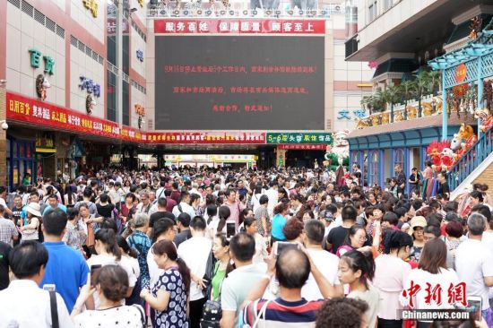 9月15日,市民齊聚天意批發(fā)市場(chǎng)中購(gòu)物。天意商城是北京規(guī)模最大的小商品批發(fā)兼零售市場(chǎng),為疏解北京非首都功能,天意商城將于本月16日關(guān)門(mén)停業(yè)。中新社記者 韓海丹 攝