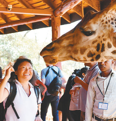 | 近年來,春節(jié)期間前往非洲旅游的中國(guó)游客逐漸增多。今年春節(jié)期間,在肯尼亞首都內(nèi)羅畢的長(zhǎng)頸鹿中心,一名中國(guó)游客和長(zhǎng)頸鹿互動(dòng)。 |