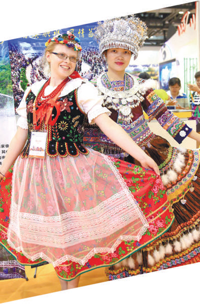 | 在2017北京國(guó)際旅游博覽會(huì)上,來自波蘭的安娜(左)和來自廣西柳州市融水苗族自治縣的張鳳媚合影留念。 |
