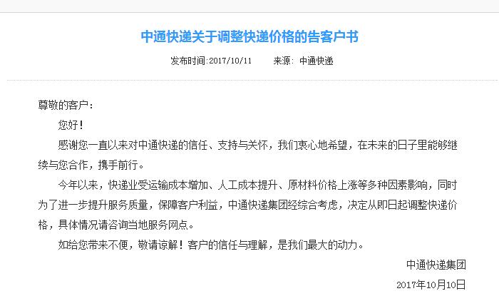 中通快遞官網(wǎng)稱將調(diào)整快遞價格