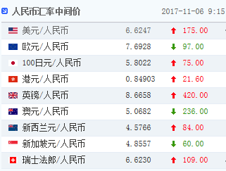 中國人民銀行授權(quán)中國外匯交易中心公布,2017年11月6日銀行間外匯市場人民幣匯率中間價為:1美元對人民幣6.6247元,1歐元對人民幣7.6928元,100日元對人民幣5.8022元,1港元對人民幣0.84903元,1英鎊對人民幣8.6658元,1澳大利亞元對人民幣5.0682元,1新西蘭元對人民幣4.5766元,1新加坡元對人民幣4.8557元,1瑞士法郎對人民幣6.6230元,1加拿大元對人民幣5.1922元,人民幣1元對0.63912馬來西亞林吉特,人民幣1元對8.8913俄羅斯盧布,人民幣1元對2.1441南非蘭特,人民幣1元對168.31韓元,人民幣1元對0.55429阿聯(lián)酋迪拉姆,人民幣1元對0.56597沙特里亞爾,人民幣1元對40.3678匈牙利福林,人民幣1元對0.55153波蘭茲羅提,人民幣1元對0.9672丹麥克朗,人民幣1元對1.2724瑞典克朗,人民幣1元對1.2322挪威克朗,人民幣1元對0.58621土耳其里拉,人民幣1元對2.8929墨西哥比索。