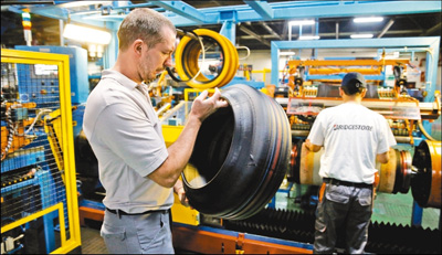 | 經(jīng)過5年溫和復(fù)蘇,歐洲經(jīng)濟增長開始提速,2017年歐盟所有成員國10年來首次共同出現(xiàn)經(jīng)濟正增長。圖為在法國普利司通輪胎廠,員工正在對輪胎進行檢查。 |
