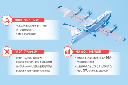 近日,AG600大型水陸兩棲飛機(jī)“鯤龍”首飛成功,黨中央、國務(wù)院發(fā)賀電表示熱烈的祝賀和親切的慰問。AG600與運(yùn)—20大型運(yùn)輸機(jī)、C919大型噴氣式客機(jī)一起,被稱為中國大飛機(jī)“三兄弟”。
