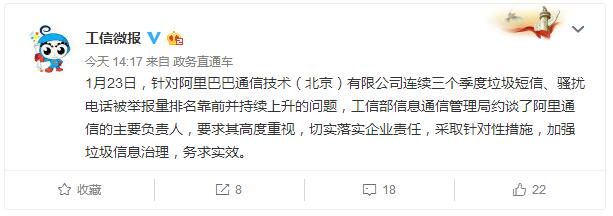 人民網(wǎng)北京1月24日電 據(jù)工業(yè)和信息化部信息中心官微@工信微報(bào)消息,昨日,針對(duì)阿里巴巴通信技術(shù)(北京)有限公司連續(xù)三個(gè)季度垃圾短信、騷擾電話被舉報(bào)量排名靠前并持續(xù)上升的問題,工信部信息通信管理局約談了阿里通信的主要負(fù)責(zé)人,要求其高度重視,切實(shí)落實(shí)企業(yè)責(zé)任,采取針對(duì)性措施,加強(qiáng)垃圾信息治理,務(wù)求實(shí)效。(朱江)LQm安康新聞網(wǎng)
