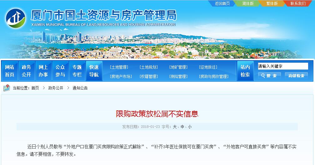 人民網(wǎng)北京1月24日電 據(jù)福建省廈門市國(guó)土資源與房產(chǎn)管理局官方網(wǎng)站消息,近日個(gè)別人員散布“外地戶口在廈門買房限購(gòu)政策正式解除”、“補(bǔ)齊3年醫(yī)社保就可在廈門買房”、“外地客戶可直接買房”等內(nèi)容屬不實(shí)信息。ZmY安康新聞網(wǎng)