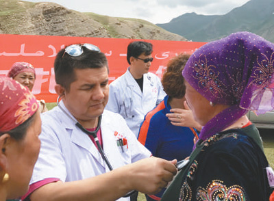 由克州人民醫(yī)院江蘇援疆醫(yī)療專家組成的義診團隊來到烏恰縣吾合沙魯鄉(xiāng)和玉其塔什草原,為當?shù)剞r(nóng)牧民送醫(yī)送藥。 |