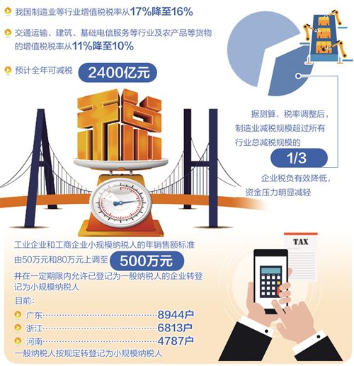 從5月1日起,我國制造業(yè)等行業(yè)增值稅稅率從17%降至16%,交通運輸、建筑、基礎(chǔ)電信服務(wù)等行業(yè)及農(nóng)產(chǎn)品等貨物的增值稅稅率從11%降至10%,預(yù)計全年可減稅2400億元。