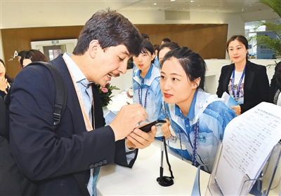 本次峰會志愿者服裝設(shè)計(jì)采用靈動的海浪線條為主元素,因此,志愿者們被親切地稱為“小浪花”,構(gòu)成了黃海之濱一道亮眼風(fēng)景線。圖為6月6日,一名來自塔吉克斯坦的記者在新聞中心問詢臺向志愿者咨詢。 |