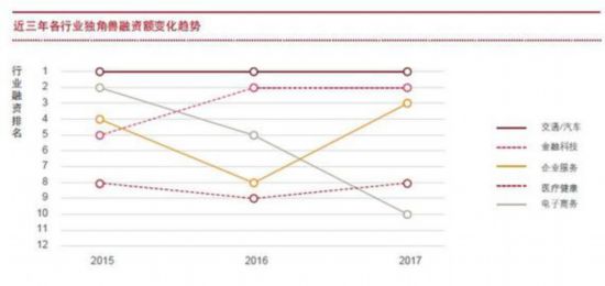 2017年,獨角獸公司年度融資總額排在前三位的行業(yè)是交通汽車、金融科技和企業(yè)服務(wù)。其中,交通汽車和金融科技領(lǐng)域在最近三年一直受到投資機構(gòu)和投資人的熱捧。
