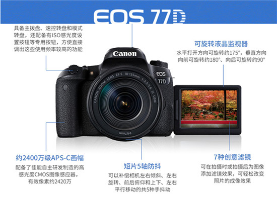 最后,不得不提的佳能77D,雙套對焦系統(tǒng)的高性能單反機,攝影愛好者的新選擇,專業(yè)的操作系統(tǒng)實用便捷的相機設(shè)計,雙核自動對焦5軸防抖,內(nèi)置WiFi/NFC/藍(lán)牙,照片及時分享,兼顧了便攜的體積與專業(yè)的操控,同時在機身性能上也有著不俗的配置。而在畫質(zhì)、控噪方面,77D同樣有著良好的表現(xiàn)。
