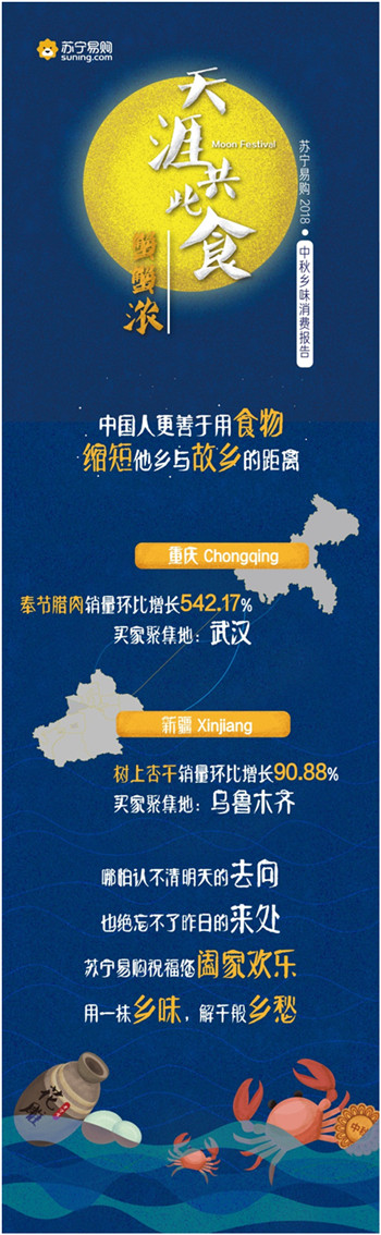 9月23日,蘇寧易購發(fā)布了“天涯共此食·中秋鄉(xiāng)味消費報告”。報告顯示,中秋節(jié)期間蘇寧易購月餅銷量同比增長287.21%,五仁月餅一改以往被“嫌棄”的形象,成為最受歡迎的口味之一;大閘蟹銷量同比增長1821%,4兩公蟹與3兩母蟹的組合賣得最好,南京一舉成為“最敢吃螃蟹”的城市。