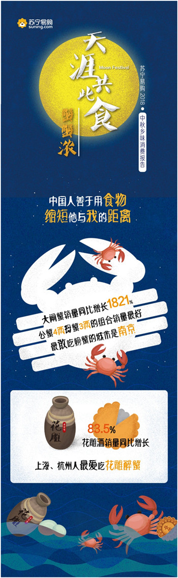如今,大閘蟹已經(jīng)成為人們中秋餐桌上的標(biāo)配。今年4月,蘇寧生鮮與陽澄湖大閘蟹協(xié)會展開戰(zhàn)略合作,蘇寧線上自營的大閘蟹全部都來自陽澄湖。9月以來,蘇寧易購大閘蟹的銷量同比增長為1821%,南京、上海、北京、廣州、沈陽成為“最敢吃螃蟹”的城市,4兩公蟹3兩母蟹的組合最受消費者歡迎。此外,蘇寧易購花雕酒的銷量也同比增長83.5%,數(shù)據(jù)顯示,上海和杭州人最愛吃花雕醉蟹。
