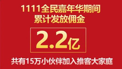 尤其是全民嘉年華超級(jí)現(xiàn)金獎(jiǎng)勵(lì)(全平臺(tái)訂單每單都有定額現(xiàn)金補(bǔ)貼,最高每單4元,單數(shù)上不封頂)極大激發(fā)了推客們的熱情,為此蘇寧推客“大出血”整個(gè)雙十一期間累計(jì)發(fā)放2.2億傭金獎(jiǎng)勵(lì),新增用戶15萬。