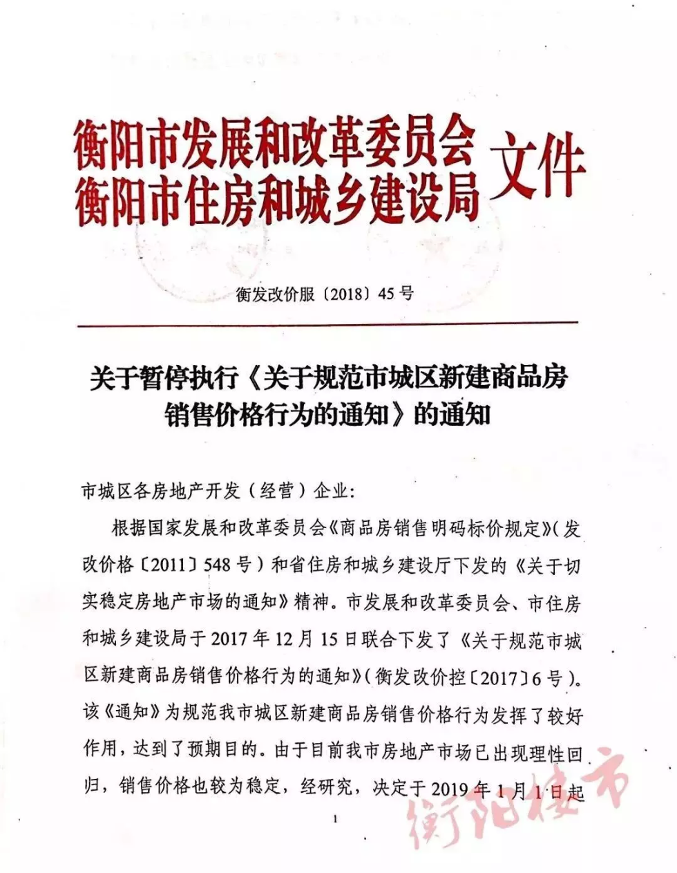衡陽樓市微信公眾號26日公布衡陽發(fā)改委和住建局聯(lián)合下發(fā)的一份文件,自2019年1月1日起暫停執(zhí)行此前的商品房限價政策。