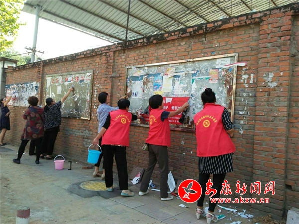 后張嶺社區(qū)組織志愿者、低保戶和保潔員對(duì)轄區(qū)的小野廣告進(jìn)行集中清理。